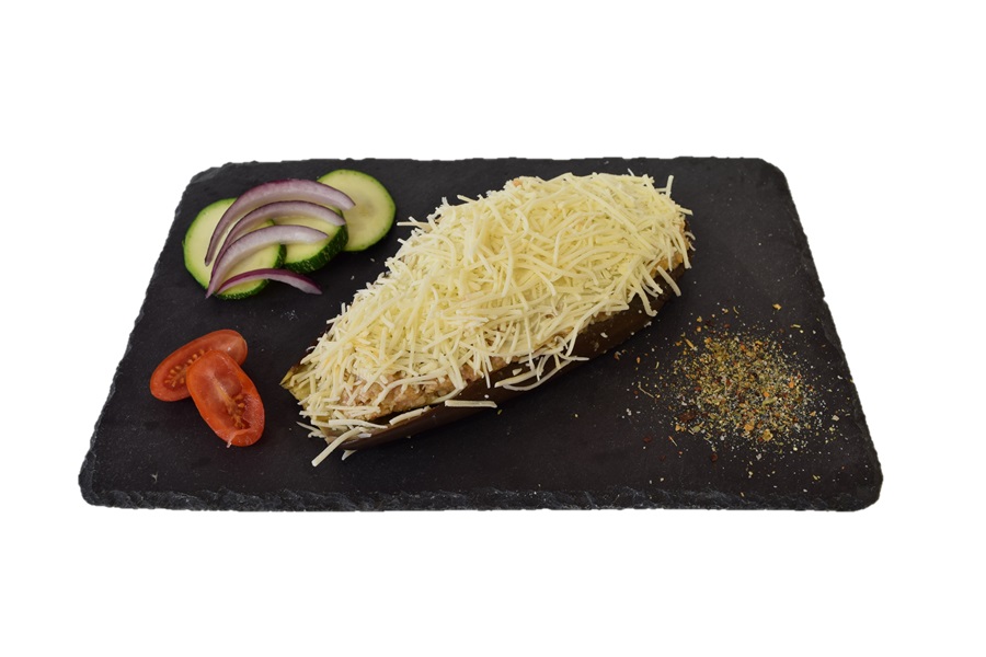 BERENJENAS ASADAS RELLENAS DE CARNE DE POLLO, BERENJENA Y QUESO GRATINAR.