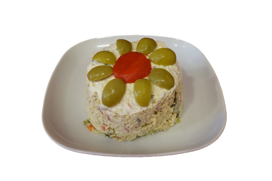 Pechugas de pollo a la plancha a trozos pequeños, huevo cocido, bonito, picadillo de encurtidos.