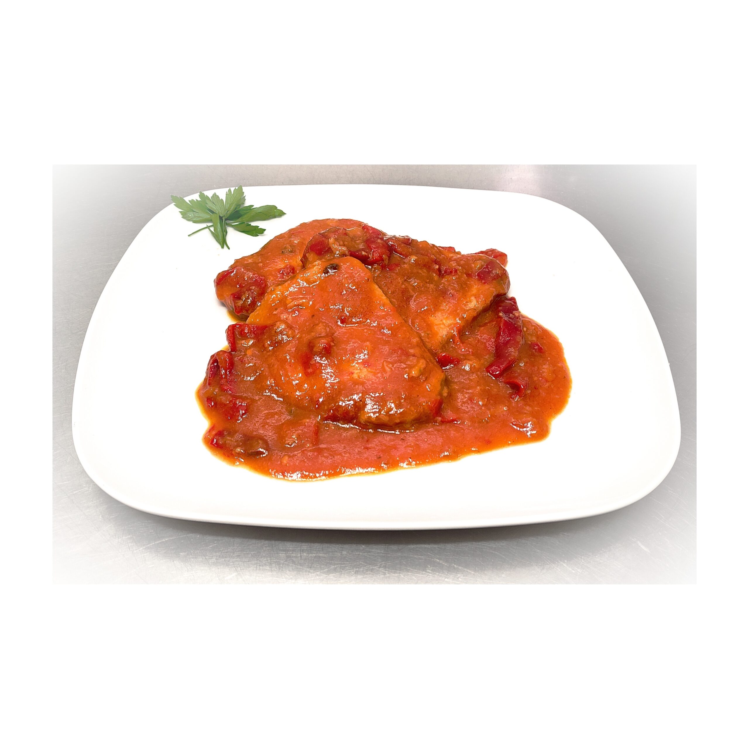 Lomo de cerdo a la riojana (con tomate y pimientos). Listo para calentar y comer.